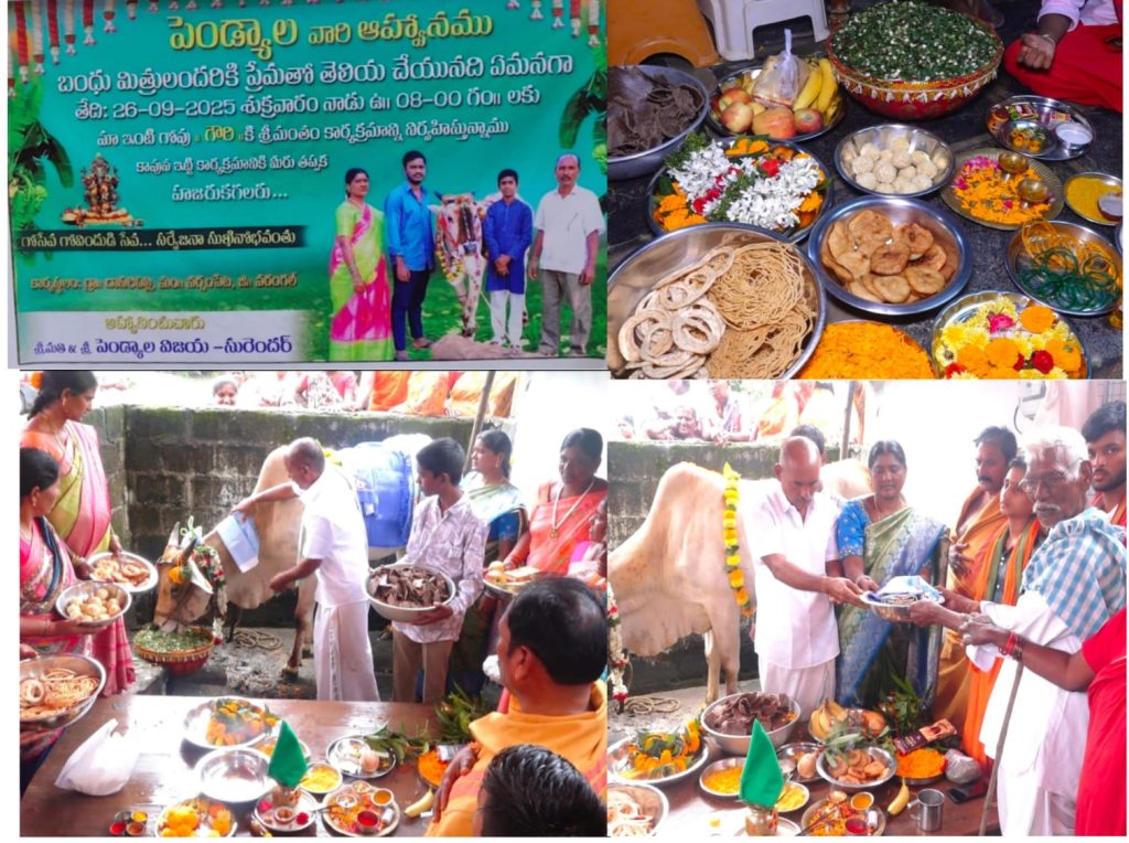 NOB-Warangal news: These are the days when we forget that man is also a part of nature. This is a time when the very existence of nature is being questioned amidst time and technology and machines. In this culture that is growing up without even seeing the children born somewhere in the current society, a cow that has been killed has been innovatively raised and then raised as a witness to the love that has been raised in the current world, and to show the love, motherhood, and the bond between mother and father towards loving the cow, some people have taken up an innovative program and have the cow tied to the back of its mother and father, reminding us of the connection that man has with the creatures of nature. In this, some humanitarians are running cow shelters for cows, which have a special place in Indian tradition. One such cowshed is Maharshi Goshal in Chintagattu, the current center of Hasanparthi Mandal in Hanumakonda District, Warangal District. Pendyala Surender, a native of Dasari Palle village in Narsampeta Mandal in Warangal District, has been working as a cowherd for the past 30 years. He has been raising a cow from five years ago and named it Gauri. In this process, the (cow) that has reached adulthood. Gauri was artificially inseminated and became pregnant. Two days ago, he went to every house in the village to invite guests to Gauri Seemanth. On 26.09.2025, a grand Seemanth was arranged in the premises of Surender’s house. Speaking at this program, Pendyala Surender said that Hindus consider the cow mother to be a goddess, hence this worship. This has been done in many places to remind people of their connection with the creatures of nature. They said that the program was undertaken with the belief that worshipping the cow will bring them eight blessings and complete health. The program began with the cow mother (Gauri), who was considered the daughter of the house, being smeared with turmeric and saffron, presented with new clothes, and offered dakshans to the cow. While the priests performed the puja by reciting mantras and chanting mantras, local women performed pradakshinas around the cow mother and cast akshintas. A large number of women participated in the program. Later, Tirtha Prasadam and Annadanam were arranged for all those who participated in the ceremony.