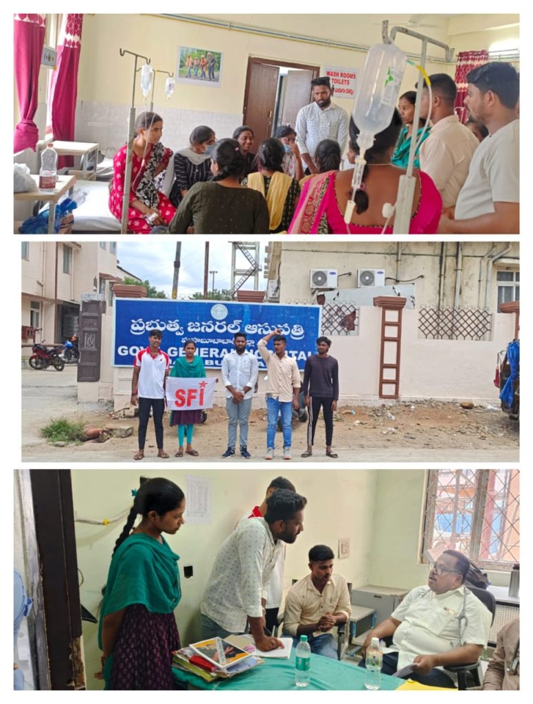 NOB- Mahabubabad news: SFI Mahabubabad District President Gandasiri Jyoti Basu demanded that strict action be taken against those responsible for the food poisoning of nursing college students in Mahabubabad district headquarters. On this occasion, SFI inspected the sick students at Mahabubabad General Hospital under the SFI. Later, SFI leaders asked the hospital superintendent to take special care of the health of the students. Speaking on this occasion, he said that the food poisoning occurred due to the negligence of the authorities towards the food of nursing college students. He demanded that a proper investigation be conducted into the food poisoning and strict action be taken against those responsible. He warned that agitation programs will be organized under the SFI. SFI Mahabubabad Town Secretary Gundla Rakesh, District leaders Ganesh, Mahesh, Vinod, Pramod, Bhavani, and Vanitha participated in the program.