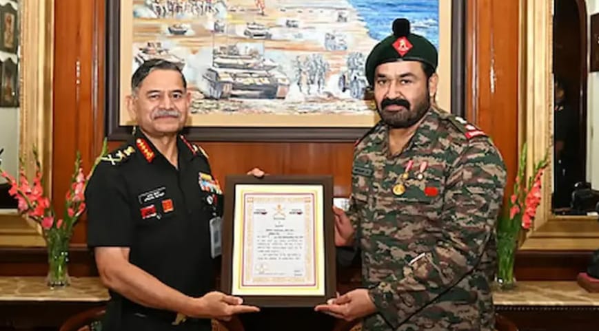 NOB- Bharat news: Malayalam superstar Mohanlal, who has left an indelible mark on the hearts of the audience with his brilliant acting for four decades in the Indian film industry, has already received several national awards and international acclaim. He has now been awarded the most prestigious “COAS Commendation” award from the Indian Army. This award is presented every year by the Chief of Army Staff of the Indian Army to individuals who have rendered distinguished service Indian Army Chief General Upendra Dwivedi himself presented this award to Mohanlal. Mohanlal participated in the program held at the Army Headquarters in New Delhi on 07.10.2025 with the rank of Lieutenant Colonel. This award, given to honor those who have rendered distinguished service in the army, has achieved another significance in Mohanlal’s career. On this occasion, Mohanlal shared his happiness through social media. “I am proud to receive this award from the hands of Army Chief of Staff General Upendra Dwivedi. It is an inspiring moment in my life to receive this recognition as an honorary Lieutenant Colonel. My heartfelt thanks to all the Indian Army and Territorial Army units.”