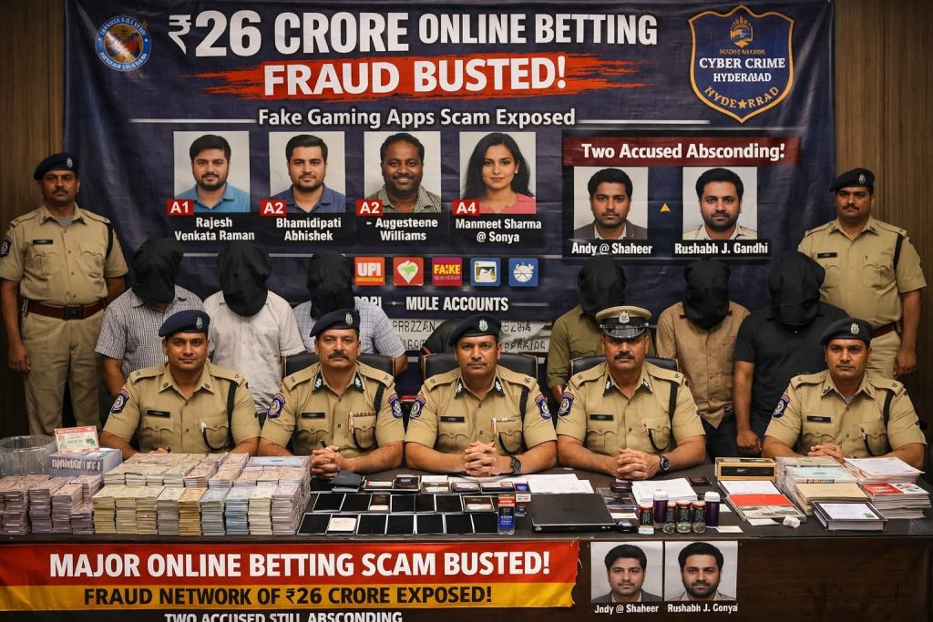 NOB-Hyderabad news: Cyber Crime Police, Hyderabad dismantled a major online betting fraud network involving transactions of over Rs.26 crore. The case emerged after a 24-year-old woman from Hyderabad lost around Rs.30 lakh after being lured through a fake Instagram advertisement into a fraudulent gaming platform, where initial small withdrawals built trust before she was pushed into making large UPI deposits, ultimately leading to heavy losses and frozen bank accounts. The fraud was masterminded by accused Rajesh Venkata Raman (A-1), who managed payment gateways, with support from Bhamidipati Abhishek (A-2) and Augustene Williams (A-3) handling operations. Manmeet Sharma @ Sonya (A-4) facilitated the use of fake KYC documents to open mule accounts. The accused operated fake payment gateways like CloseX Pay, Trustly Pay, and Accult Pay, routing funds through multiple accounts using forged documents and shell companies while earning commissions at each stage. Two accused, Andy @ Shaheer and Rushabh Jasvantrai Gandhi, are absconding. Police seized electronic devices, cheque books, fake stamps, and cash. Authorities warned the public to avoid online betting platforms, as they are illegal and designed to cause financial loss.