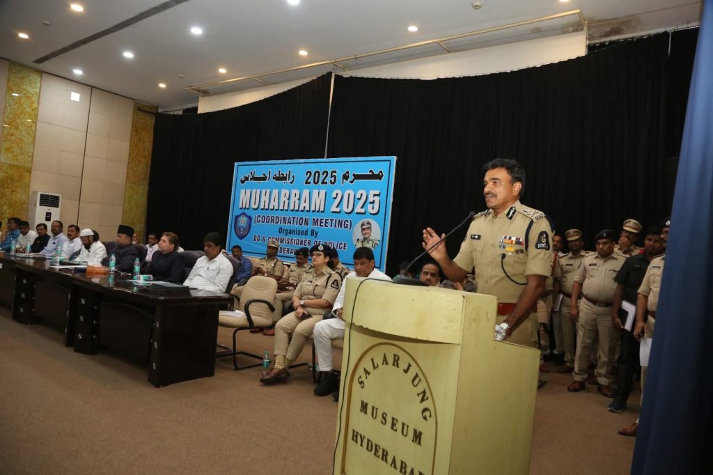 NOB- Hyderabad news: A high-level coordination meeting, chaired by C.V. Anand, IPS, DG & Commissioner of Police, Hyderabad, was held on 24.06.2025 at the Salarjung Museum to review and finalize arrangements for the upcoming Muharram Bibi-ka-Alam procession, expected on July 6th or 7th, 2025. The meeting was attended by Shia religious leaders, elected representatives, and senior officials from various government departments including GHMC, R&B, Electricity, Water Works, Medical & Health, Fire Services, Nehru Zoological Park, and the Telangana Waqf Board. Key aspects such as security, traffic management, sanitation, public health, and other management were discussed in detail. The Commissioner directed all departments to coordinate closely to ensure smooth and peaceful conduct of the procession. Deployment of police forces, CCTV surveillance via TGICCC, traffic diversions, and SHE Teams were confirmed. Officials were instructed to ensure adequate parking, barricading, and public convenience measures. The meeting was attended by senior police officers, zonal DCPs, MLAs, MLCs, Waqf Board officials, and religious representatives.