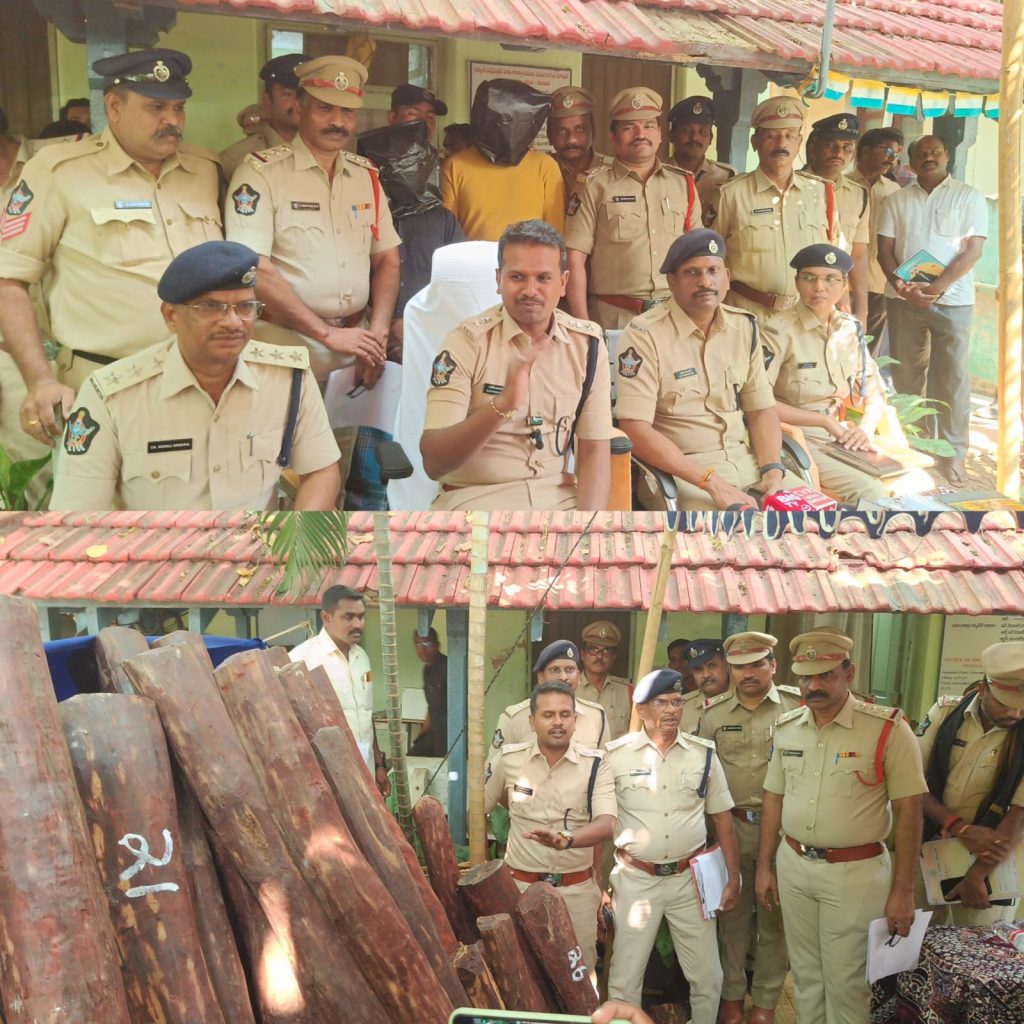 NOB- Guntur news: According to the information received, 49 red sandalwood logs worth Rs 4.5 crore and weighing 1201 kg, which were being smuggled illegally from Tamil Nadu to West Bengal, were being transported in a lorry in the middle of an A4 paper bundle. Guntur District SP Satish Kumar said that they were inspected at the toll gate and seized. Speaking to the media at the Mangalagiri Rural Circle Police Station premises on 06.12.2024, the SP said that the lorry drivers Sarathi Kannan and Joy Praveen from Tamil Nadu who were involved in the smuggling were arrested on 05.12.2024. Satish Kumar revealed that they are investigating the case from the perspective of who is involved in this. Similarly, it would be difficult to smuggle red sandalwood from Tamil Nadu to Assam, Guwahati, West Bengal via Siruguri via another route, but these red sandalwood smuggling logs are planned and transported through various methods to Andhra Pradesh. He said that the focus should be more on ganja, but compared to the past, there has been a decrease, and more cases have been registered against those who buy and sell ganja. Similarly, people who use ganja have been identified and they were counseled in ftront of their parents. He said that the accused involved in smuggling red sandalwood have been arrested and a case has been registered against them and a full investigation is underway. The SP said that they will be produced before the court. A.S.P. Ravikumar, D.S.P. Bhargavi, North DSP. Muralikrishna, Mangalagiri Rural CI Y. Srinivasa Rao, Town CI D. Vinod Kumar, Rural SI. Chirumamilla Venkat, staff, A.S.I.P. Srinivasa Rao, T. B. B. Shankara Rao, B. Ramesh Babu, K. Ratna Raju, Head Constable D. Shyam Kumar, B. Ramalingeswara Rao, Constable Ganesh Babu, Ramu and others participated in this media conference.