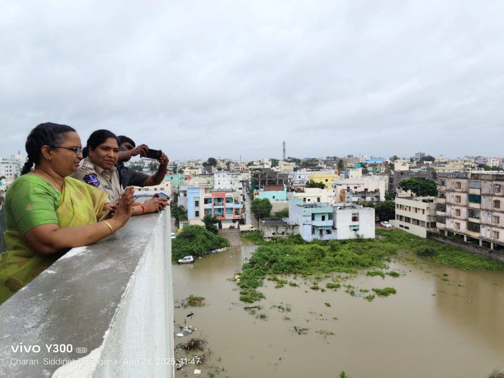 NOB-Siddipet news: District Collector Haimavathy along with Police Commissioner Anuradha inspected several colonies submerged in the district center due to the incessant heavy rains for the last two days on 28.08.2025. Police officials have been instructed to inspect the areas where water has entered the bridge along the road between New Bus Stand and Modern Bus Stand and to stop traffic until the water level subsides. Revenue officials have been instructed to inspect the submerged area in Srinagar Colony from a private apartment and to call NDRF teams to evacuate the residents of the submerged colony to safe areas and divert them to rehabilitation centers. Officials have been instructed to be alert as water is flowing rapidly from the Komati Cheruvu Matadi. They inspected the area where water is flowing rapidly through the bridge from Ensanpally to Komati Cheruvu. He instructed the officials to inspect the area where water is flowing rapidly through the culvert in front of Sri Chaitanya School and to place sandbags in the damaged area of the road to prevent erosion. He instructed the officials of the Irrigation Department to inspect the submerged area in Srinivas Nagar Colony, the submerged area of Narsapur Lake from above Lohit Sai Hospital, and the stagnant area of Narsapur Lake below and take steps to ensure that the water flows quickly. They were accompanied by ACP Ravinder, Tehsildar Kiran, police and other department officials and others.