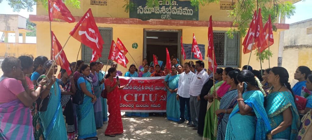 NOB- Nandyala district news: Andhra Pradesh Anganwadi Workers and Helpers Union District President Shebharani, CITU District Assistant Secretary T.Sivaram, Mandal and Town Presidents P. Ramanjaneyulu, N, Srikanth demanded on 15.06.2023 that a dharna program was held near the local ICDS office under the chairmanship of Mandal Secretary NK Nagalakshmi to resolve the problems of the Anganwadi workers. On this occasion, they said that Jaganmohan Reddy’s promise to increase the wages of Anganwadis more than Telangana, protect ICDS, provide job security to Anganwadis, pension, PF , ESI, retirement benefit of five lakhs, pension of half the salary, government welfare schemes should be implemented for Anganwadis, age limit for promotion of helpers should be increased to 50 years, political interference in promotions should be stopped, mini centers with population exceeding 300 should be converted into main centers, medical leave facility with pay should be provided.They demanded that when in service if died then to one of the family members of those who died in India should be given a job, insurance should be implemented, quality food should be supplied to the beneficiaries, and the quantity of oil and pulses should be increased. In the current period, the prices of petrol, diesel, gas and essential commodities have increased many times due to the anti-people policies of the government. They expressed their displeasure that the wages are not being increased accordingly. In 2018, the central government had announced an increase of wage of 1500 for Anganwadi workers, 750 for helpers, and 1250 for mini worker, but it has not been implemented so far. TA bills have not been given since 2017. They complained that even though equal pay and gratuity should be implemented for work, it has not been implemented so far and the burden of work has been increased by introducing various apps. Anganwadis have been pushed into a situation where they have to invest in the maintenance of the centers.Many people are insulting and harassing them in the name of visits. The proof of this is the ruthless killing of Hanumayamma in the Tanguturu project of Prakasam district by political factions. In the background of the fact that there is no direction to give at least the cost of land, the Anganwadi issues are have to be resolved immediately as part of the all-India protests on July 10th and 11th 2023. It was clarified that agitation programs are being organized at the collector’s offices on the occasion of the day. Later senior assistant Eswariah was handed over a memorandum with the goals. In this program, district vice president Shamim Begum, Gausia, Devi Anganwadi Union leader Gulzar B, Nagalakshmi, Mary, Rajeshwari, Varalakshmi more than 60 Anganwadis. Workers participated.