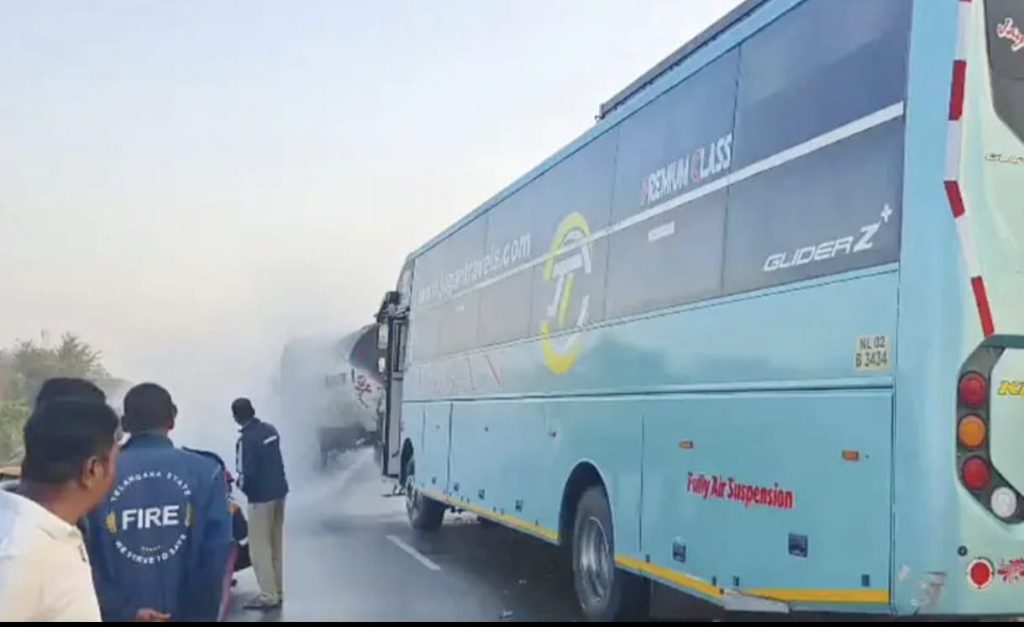 NOB-Mahabubnagar news: A private travel bus hit a tanker carrying hydrochloric acid on the Machram flyover near Jarcharla in Mahbubnagar district on 20.11.2025 morning, causing panic among the passengers. According to officials, all the passengers were safe. Around 40 passengers were travelling in the bus. The bus was coming from Chittoor in Andhra Pradesh to Hyderabad. The bus hit the tanker from behind, as a result of which hydrochloric acid flowed on the road and smoke spread at the accident site. The bus driver, demonstrating his courage, immediately got all the passengers off, some of the passengers came out through the emergency exit. A few people suffered minor injuries in the accident. Reports said that there was no fire after the accident, due to which a major accident was averted. Fire tenders reached the spot and the employees brought the situation under control. Traffic on National Highway 44 was affected after the accident. Authorities transferred the passengers of the bus that was involved in the accident to Hyderabad in another bus.