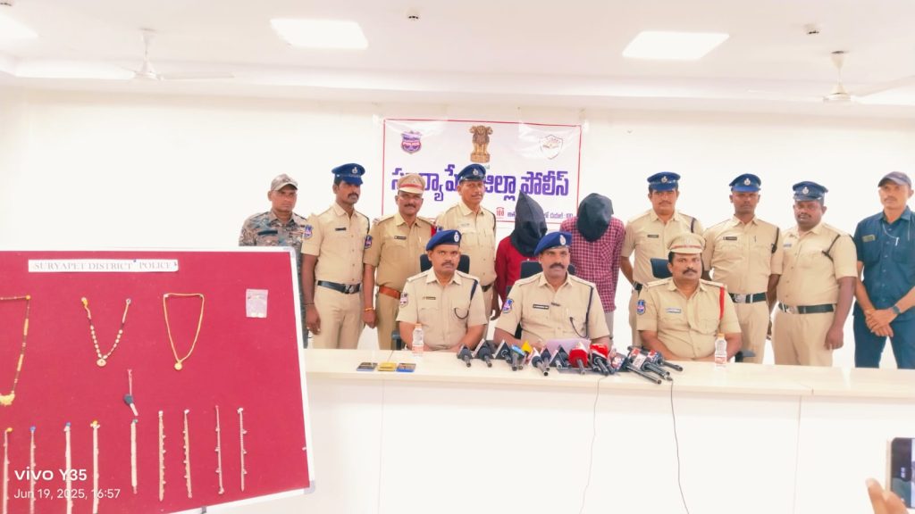 NOB- Kodada news: SP said that the accused target locked houses at night, break the locks of the houses and enter inside to steal valuable gold and silver ornaments, target lonely elderly people and women traveling alone in vehicles and snatch gold ornaments from women and do chain snatching. Last month, chain snatching was committed from a lonely woman in Kodada town, and chain snatching was also committed in Munagala area, the cases were investigated under the supervision of Kodada inspector and Munagala inspector. They said that both of these were done on an expensive KTM bike. While the police were making efforts, on reliable information, the Kodad town police arrested 4 accused from Kodada and Huzurnagar towns in Kodada on 19.06.2025. When questioned, they confessed to committing thefts. There are two minor boys in this case, they will be presented before the juvenile court, he said. He said that strict action will be taken against those who commit such crimes, and sheets are being registered against those who commit crimes on a regular basis. He said that people should be vigilant, and if they come across any suspects, they should call the local police or dial 100 and give information. A1 Phani Chand came to the house of A2 Nagendra Babu in Kodad town at 6 am on 19.06.2025 to divide the stolen money, gold and silver ornaments into shares and sell them. On reliable information, the Kodad town police arrested them and took them to the police station. When they were questioned, they confessed to the thefts. A total of 7 cases of 8 tolas of gold and silver, an expensive KTM bike, and three cell phones worth 60 thousand were seized from them. A1 and A2 are acquaintances. They target locked houses at night, break the locks of the houses, enter inside and steal valuable gold and silver ornaments. Similarly, they snatch valuable gold ornaments from single women. The accused A1 Phani Chand was addicted to alcohol and committed thefts along with his friends. A1 was booked for theft in Kodada Town, Huzurnagar, Choutuppal, Ananthagiri, Nelakondapalli, Munagala, and Chilukuru, Vemulapalli, Nidamanur police stations and went to jail several times. Kodada Town Inspector K. Siva Shankar, who done great job in solving the case, led a team of SI B. Sudheer Kumar, ASI B. Hanuman, HCs B. Srinivas, Karunakar, Krishna, PCs Yella Reddy, Kondalu, Satish and police station staff were felicitated and rewards were announced. Previous Cases on A1- 17 cases Kodada Town PS 3 cases, Anantagiri PS 2 cases, Munagala PS 2 cases, Nareducherla, Nelakondapalli, Choutuppal PSs each have one case. Cases detected on 19.06.2025 are Kodada Town 4 cases, Munagala 1 case, Nidamanur PS 1 case in Nalgonda district, Vemulapalli PS 1.