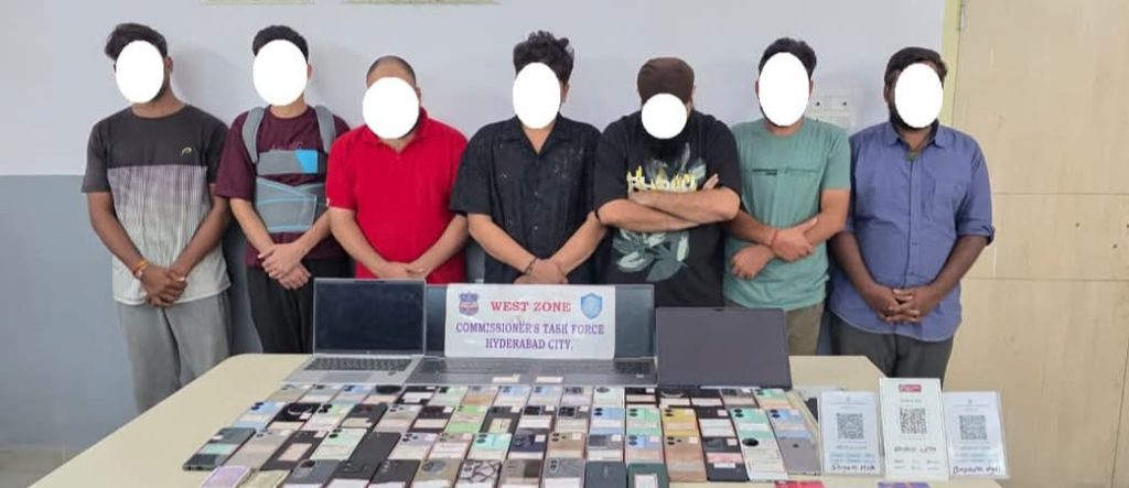 NOB- Hyderabad news: Commissioner’s Task Force, West Zone, Hyderabad, busted an illegal online betting racket and apprehended (01) Bookie, (05) Agents & (01) Punter operating through platforms like SKYEXCH, Radhe Exchange, 99 Races, 365 Races, Placebet999. Rs.25,000 Cash, 55 Mobile Phones, 3 Laptops, 1 Tab, 60 Debit Cards, 3 Scanners. Total betting points worth Rs.23.5 Lakhs identified. Accused Girish Agarwal (Bookie) with associates was running the racket by creating fake bank accounts & supplying points to punters. Swift action by Task Force ensured busting of this illegal network.